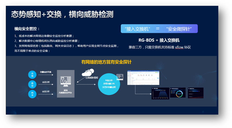 但是,网络“边缘侧”的安全依旧是监测的盲区,因为态势感知与流量探针一般部署在中心机房,接入层的横向感染不会上升到核心交换机。在理论上,可通过在每一台接入交换机侧部署一台流量探针,但这样投入巨大,不太可能落地。如何通过技术手段低成本实现横向安全检测,打破安全建设“重中心、轻边缘”的屏障,就成为了西南交大亟需解决的一个难题。