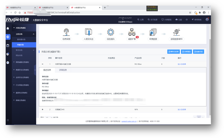 2)通过流量探针深度分析,发现一些学生终端中病毒,这引起了管理员的重视,是否存在大面积扩散的风险?通过设计采集楼层交换机的sFlow样本进行横向威胁分析,发现采集到的这台主机正在扩散感染。进一步分析后,我们发现它正在感染的目标为8个IP地址。最终,找到了1号感染源及8个被扩散的主机,学校老师第一时间进行了清查。