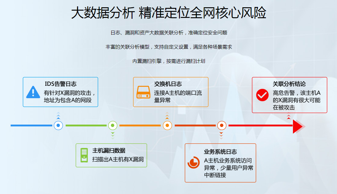 其中,大数据安全平台RG-BDS作为关键组件,把客户网络中的网络设备、服务器、数据库、中间件和安全设备等信息资产关联起来,帮助用户快速定位网络安全问题,将工单系统和尊龙时凯安全知识库相结合,实现责任到人且快速处理问题,让网络安全事件完整闭环,真正实现网络安全的动态防护。