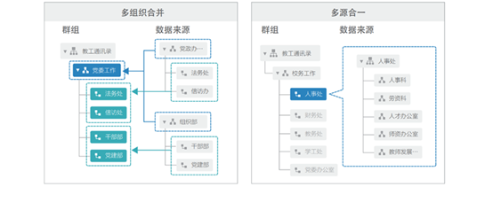 基于组织、岗位、身份标签、职务职能、身份类型五大维度灵活编排业务系统所需的各种层级工作群,实时计算人员与节点关系,自动维护人员清单,保持人员与组织关系一致
