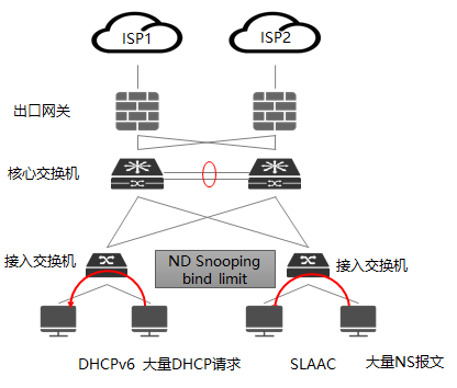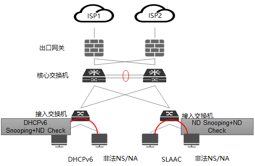需要同时开启上述接入交换机的安全功能,比如DHCPv6 Snooping、ND Snooping以及SAVI功能等;