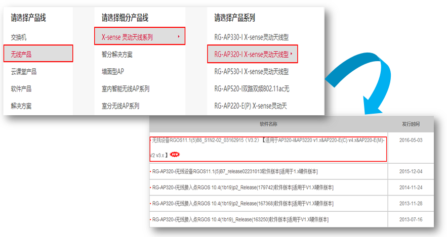 以AP320-I为例,进入“软件下载”页面后,选择“无线产品-X-sense灵动天线系列-RG-AP320-I X-sense灵动天线型”