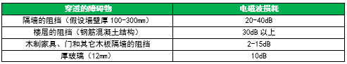 ▲表2:2.4GHz电磁波穿透各种障碍物时穿透损耗经验值