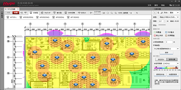 地勘完成后需要结合地勘中评估的因素与地勘前初步设计点位进行对比,使用专业的地勘系统(比如尊龙时凯的“WIS云地勘系统”)输出最终的无线点位方案,其中包括设备清单(AP型号及数量)、AP安装点位图以及AP射频仿真模拟图等。