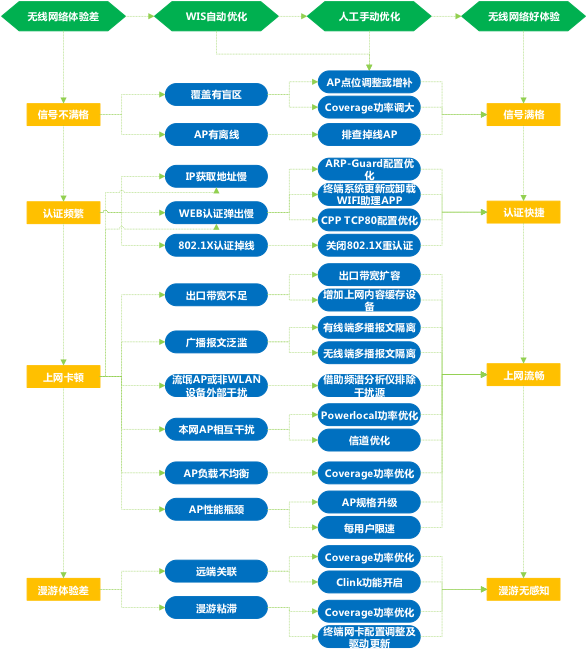 无线功能部署完成后,接下来要进入无线网络优化的阶段。无线优化就是为无线体验差到无线体验好所做的一系列操作,无线优化可采用WIS自动优化和人工手动优化两种方式,建议优先使用WIS一键优化进行智能优化,可解决大部分问题,然后建议按照下图思路进行人工精细优化。