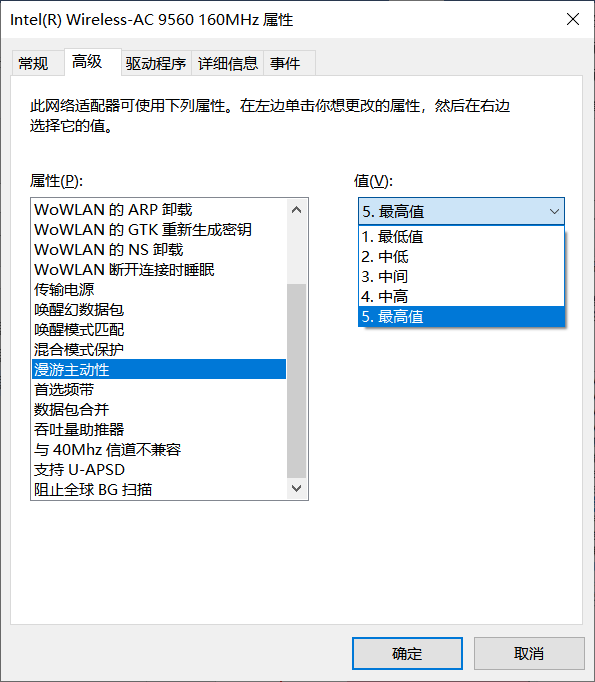 2)设置终端网卡的漫游灵敏度为最高值,确保终端可以顺畅在不同的AP间漫游。较低漫游感知能力将导致终端无法及时切换到信号较好的AP。