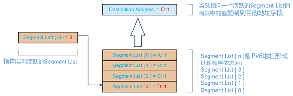 在SRv6转发过程中,IPv6 Header的目的地址(Destination Address)字段不断变化。其值由SRH中的Segment Left(SL)和Segment List共同决定。当SL指向一个活跃的Segment List时,该Segment List中的路径分段信息被复制到IPv6 Header的目的地址字段,如下图所示。