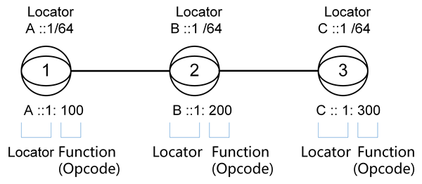 如下图所示,在节点1、节点2和节点3上分别配置Locator,并且为各个节点配置End SID的操作码(即Opcode)。例如节点1配置Locator为A::1,并配置End SID的Opcode为100,形成节点1的本地SID:A::1:100。A::1:100在SRv6网络中表示节点1。当报文根据A::1:100路由到节点1后,节点1根据LPM(Longest Prefix Match,最长前缀匹配)匹配到本地SID中的Opcode(100),节点1知道100对应的是End SID,于是执行End SID对应的动作。