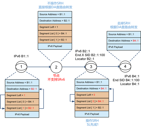 1. (3)    节点3收到报文后,根据IPv6 Header的目的地址(B2::1)查找Locator。命中End.X SID,执行End.X的转发动作: