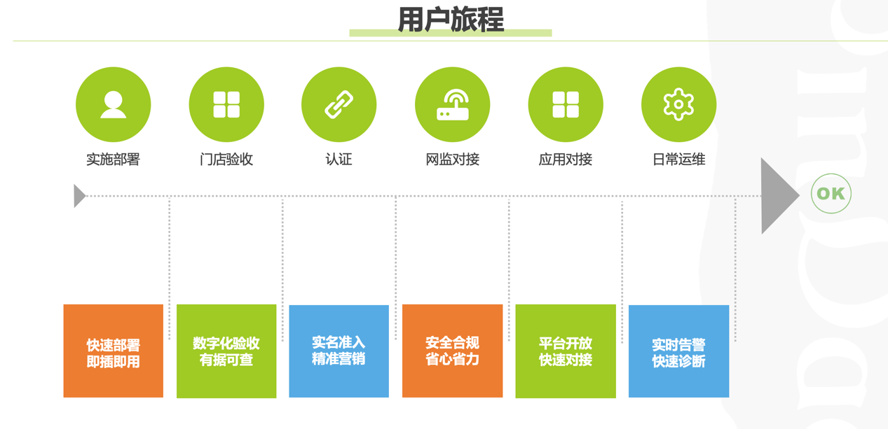 首先,实施部署非常快速部署,采用即插即用的模式。其次,门店验收,通过全数字化的验收,实现有据可查。第三,实名准入,实现客用网的网页对接和实名认证,并全力配合网监对接。第四,提供开放平台的对接,与奈雪应用系统的融合。最后,在日常运维中,看到实时告警和快速诊断。