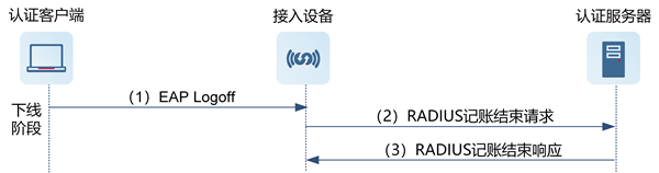 在认证下线阶段,认证客户端主动释放IP地址,发送下线报文“EAP Logoff”给接入设备。接入设备通过发起记账结束请求来通知认证服务器,终止该认证客户端的记账过程,详细报文交互过程,如图2-6所示。