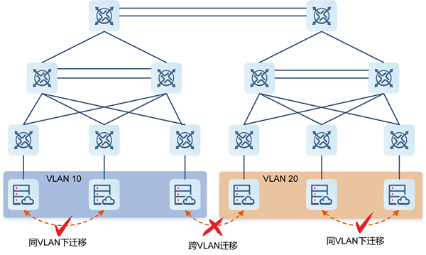 由于服务器硬件资源问题(如CPU过高、磁盘不够和内存不足等)或机房的搬迁转移,虚拟机需迁移到其他服务器上。为了保证虚拟机迁移过程中业务不被中断,要求虚拟机的MAC地址和IP地址在迁移前后不发生改变,因此虚拟机只能在当前所在二层网络中进行迁移。