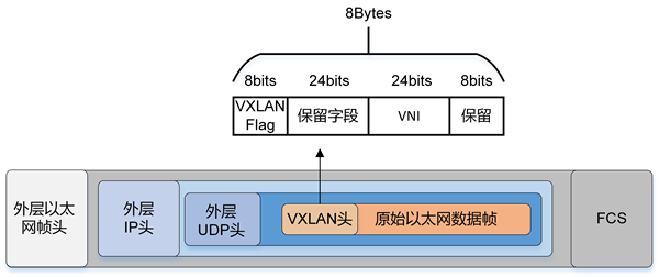 VXLAN设备在收到虚拟机发送的数据帧时会封装四个部分以形成新的帧头(内层的数据帧携带的原始目的/源MAC、内层VLAN Tag和以太网类型保持不变)。这四个部分由内而外分别是“VXLAN头部”、“外层UDP头”、“外层IP头”和“外层以太帧头”。VXLAN头和原始以太网数据帧作为UDP报文的数据段。